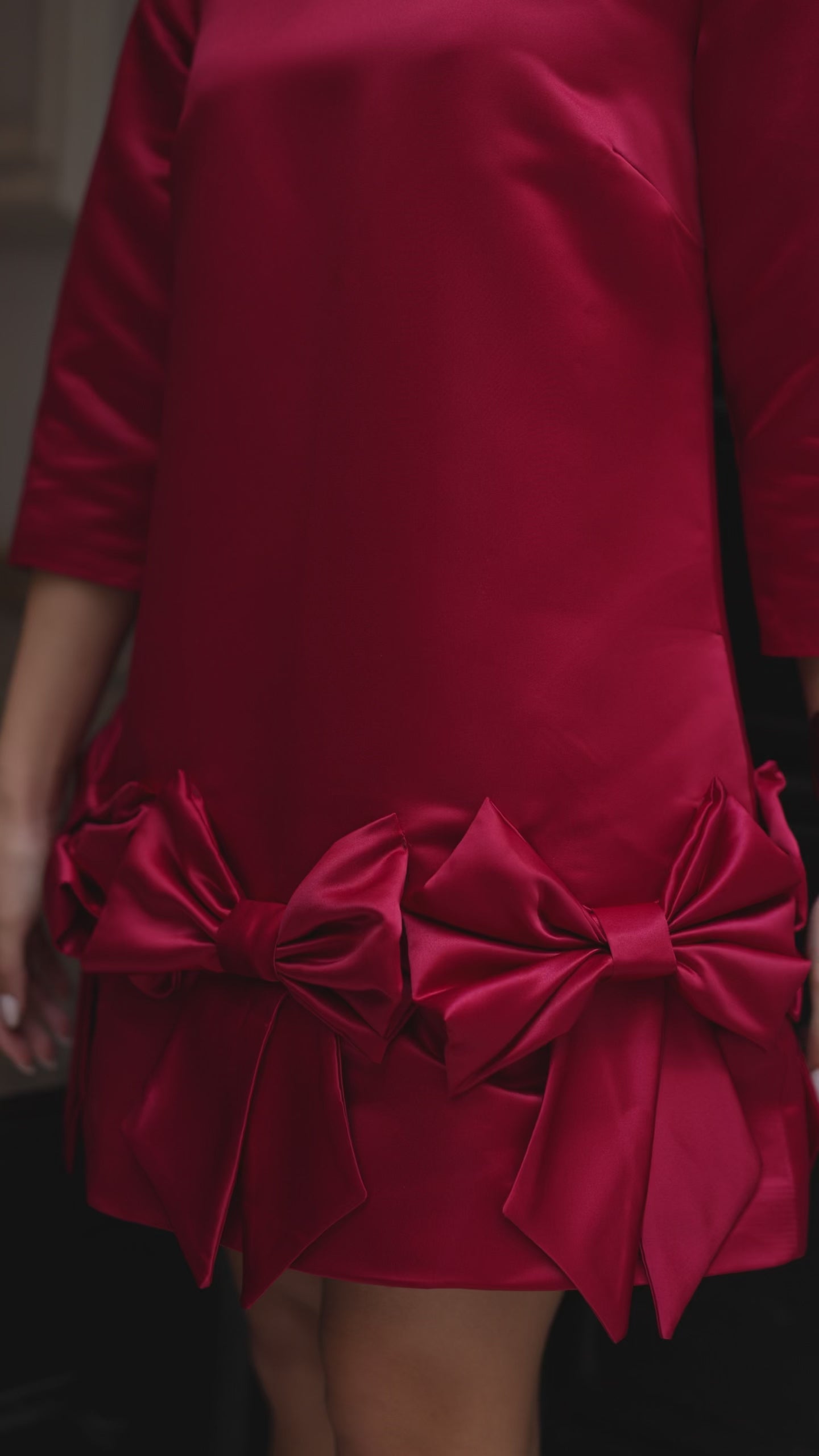 Vestido curto com decote redondo e manga comprida. Pormenor laços ao longo de toda a bainha. Bolsos ocultos na costura lateral. Forro interior. Fecho invisível oculto na costura das costas.